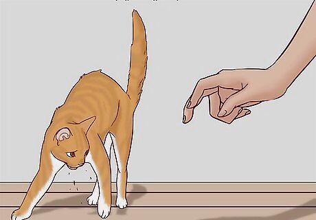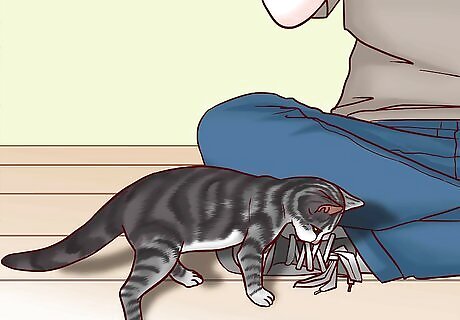 Play with the cat when they crouch with their ears forward. When a cat is feeling playful and excitable, they will crouch on their front legs and flick their tail. Use toys, a string, or a feature to lure the cat into pouncing, running, or pawing to play. Keep playing until the cat walks away or begins to use their claws. Keep in mind that when a kitten is learning how to play, they will often bite and scratch to see what they can get away with, since they don't know what will hurt you.Tip: If the cat is being too rough while you’re playing, mimic the sounds of a hurt cat by loudly yowling or wailing. This will signal to the cat that it’s hurting you and that it needs to be more gentle. If it continues to be rough, walk away from the cat to signal the end of play time.