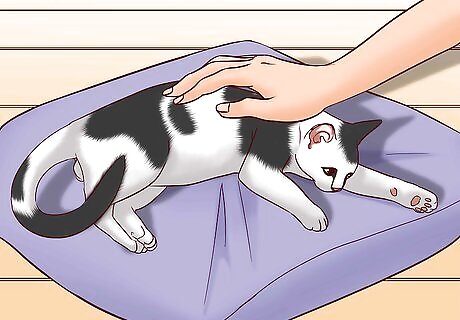 Pet the cat when they're lying down with their tail still and ears pointed forward. Observe your cat by looking at their posture as they lie on their belly or side. If the eyes are partially closed and the cat is still, run your hand along the top of their head and back. If the cat stays in one place, try petting their sides, face, and tail to see how they respond. If the cat shrinks away from your touch or gets up, stop petting them. They may be trying to take a nap!