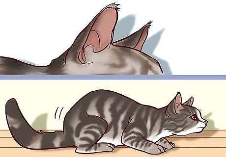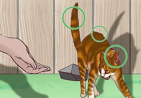 Keep away from a cat with flattened ears or fluffed fur. Cats use their ears and fur to signal when they’re hunting, threatened, or irritated. Look at the ears to see if they’re pointed straight out to the sides or toward the back of the head. If the cat's back and tail fur is standing on end, slowly move away to make sure they aren’t frightened or threatened, which can cause them to attack. Many cats will fluff their hair when they’re momentarily frightened, especially by loud noises. If your cat looks scared, try to find the object that they’re looking at and remove it from their sight.