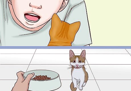 Talk in a high-pitched, happy voice when praising or feeding the cat. Associate positivity with feeding, play time, and petting. Speak in a clear, cheerful voice and make eye contact with the cat so they know you’re speaking to them. If the cat is resting, keep your voice quieter but still happy and positive. Since cats have large ears, they tend to be more sensitive to loud noises. If you frequently have to yell to get your cat’s attention, take the cat to the vet to have their hearing checked.
