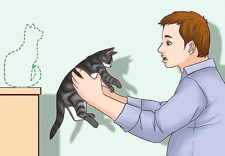Couple words with touch to communicate with your cat. When praising the cat, try petting their fur and speaking in a high voice to associate that tone with a positive experience. If you’re correcting a behavior, carefully move the cat away from the place where they misbehaved as you say “No” or “Down” in a stern tone. Never discipline a cat by harming them. This is ineffective and can seriously hurt the cat. In many areas, it is illegal to intentionally hurt an animal.