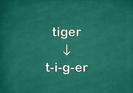 Split up each letter sound in the word to help you hear them. It's helpful to draw an underline on your paper for each sound that you hear. Don't worry about what the word is supposed to look like. Just focus on the sounds you hear when you say the word. Then think about which letter or letters might make each sound. It helps to count out the number of sounds in the word. For example, let's say you want to spell the word "tiger." You might hear four sounds: t-i-g-er.