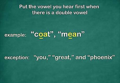 Pay attention to other double vowels. Remember the rhyme, “When two vowels go walking, the first one does the talking.” When two vowels are next to each other, often you pronounce only the first vowel. This makes it easier to place two vowels in the right order. (Of course, you have to remember that two vowels are called for in this case.) For example, you hear the “o” sound in the word “coat,” so you know the “o” comes first. You hear the “e” sound in “mean,” so you put the “e” first. Once again there are exceptions to this rule that you will need to memorize, such as “you,” “great,” and “phoenix.”