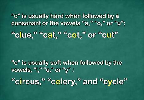Learn the “c” sound patterns. The letter “c” can be pronounced hard, as in “cat,” or soft, as in “cell.” Usually if the letter following the "c" is "a," "o," "u" or a consonant, the "c" is hard. Examples include cat, cot, cut, cute and clue. If the following letter is "e," "i" or "y," the "c" is usually soft. Examples include celery, citation and cycle.