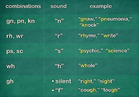 Look for consonant letter combinations where one letter is silent. English words sometimes have a letter that is silent, typically a consonant next to another consonant at the beginning of a word. Here are common letter combinations where one letter is silent: Gn, pn, and kn: These letter combinations all have an “n” sound. The other letter is silent. Examples are "gnaw," "pneumonia" and "knock." Rh and wr: Both of these combinations have an “r” sound. For example, rhyme and "write. Ps and sc: These combinations both make an “s” sound, as in psychic and science. Wh: Sometimes "wh" sounds like "h," as in "whole." "Gh" is often silent, especially if it comes after “i.” This happens in words like "right" and weight." Sometimes “gh” makes an “f” sound, as in “cough” or "tough."