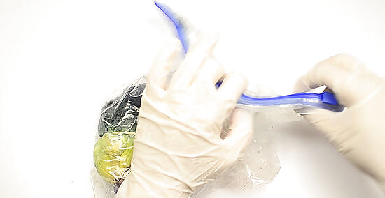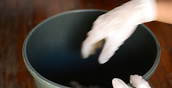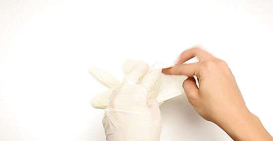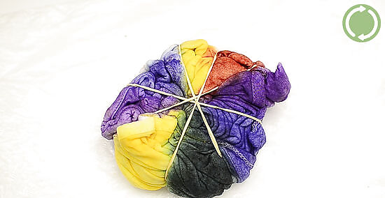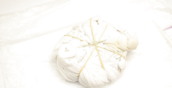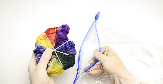 Remove the shirt from the bag with gloved hands. Put the plastic gloves back on your hands, then take the shirt out of the bag. Do not take the rubber bands off; leave them on. If you take the rubber bands off now, you risk getting dye onto the white areas of the shirt and ruining the tie dye effect.