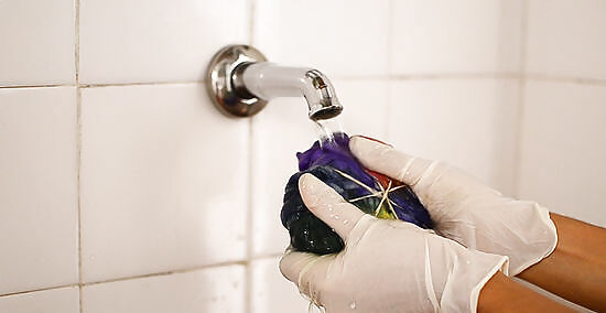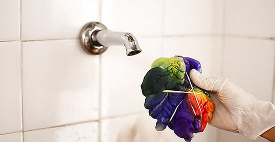 Rinse the shirt with cool water until the water runs clear. How long you rinse the shirt for depends on the brand and colors of dye that you used. Some will take a lot longer to rinse than others. Keep your gloves on for this step as the dye may still stain your hands.