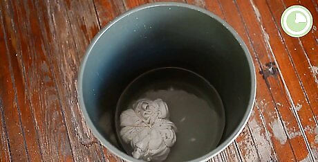 Soak the shirt in the soda ash solution for 10 to 20 minutes. Dunk the shirt into the soda ash solution, then squeeze it to ensure that it's thoroughly soaked. Leave it in the bucket for 10 to 20 minutes. If the shirt floats in the water, it's not soaked through. Squeeze it some more, or allow it to soak longer. You can remove the dust mask at this point since the soda ash and dye powders are dissolved. You should keep the gloves and old clothes/apron on, however.