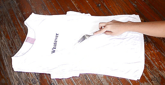Place a fork in the center of the shirt with the prongs pointing down. The fork should be perpendicular to the shirt and the surface that you’re working on. Alternatively, pinch the center of the shirt between your thumb and index finger. This will form the center of your spiral. For a more unique design, pinch elsewhere on the shirt. For example, you could pinch the top-right corner or the bottom-left corner.