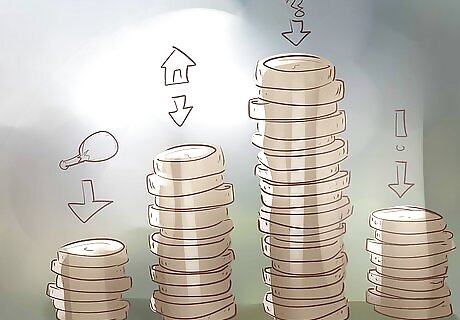 Watch for deals at the grocery store. Food and basic household expenses can constitute a large percentage of your budget. By being conscious of price here, you can save a lot of money in ways that might not significantly affect your standard of living. Cut coupons. Look for cheaper alternatives of what you normally buy. When comparing prices at the grocery store, consider using your phone to keep track of the cost of items you typically buy. This will give you a better sense for which store you should shop at. Consider grabbing a basket, as opposed to a shopping cart. The larger shopping cart will encourage you to buy more than you need.