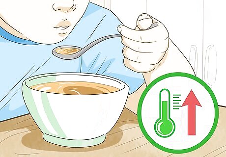 Run a fake fever by eating or drinking something warm. Have soup or tea right before your parents take your temperature. Make sure to keep the liquid in your mouth for about 5 seconds before swallowing. If you want to take this 1 step further, keep some of that warm liquid under your tongue so that it comes into contact with the thermometer as you’re getting your temperature taken. Don’t make the soup or drink too hot or you’ll burn your mouth.Tip: Only do this until you feel some symptoms coming on. The goal is to fake being sick, not to actually get sick. If you overdo it, you could end up falling sick.