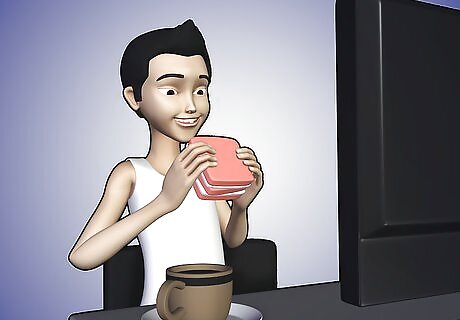 Eat. Foods that contain lots of Vitamin B12 such as cheese, milk and other dairy products will give your energy a slight boost. Fish is a good choice too. You can also eat fruits (apples, oranges) which contain Vitamin C and Protein. These foods are also very healthy and will reduce the unhealthy factor of staying awake. If you get bored of eating apple after apple, mix it up a little. Make a fruit salad containing apples, oranges, grapes, bananas and kiwis. Pour in some fruit juice if you want it even more juicy. Squirt some lemon juice on the top of it all. This will give the fruit salad an extra kick. The fruit and Vitamins will keep your energy up while the sourness of the lemon juice shocks your taste buds. If you really don't like the taste, wash it down with water.