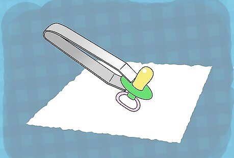 Lay the pacifier down onto a brand new cloth or terry cloth towel. Although not ideal for highly common use, use a brand new diaper for a quick solution, but don't just lay the pacifier down on any old cloth diaper. This cloth diaper must be new and directly from an unopened package - to remain sterilized and clean there too.