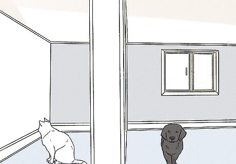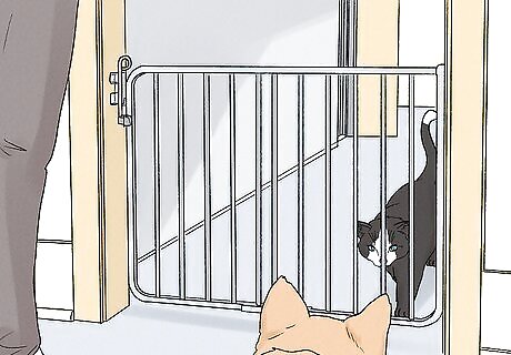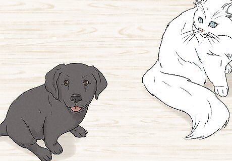 Keep your puppy and cat in separate rooms for a few days. When you introduce a new puppy to your cat, it’s important to give them time to get used to each other’s scents and sounds before they’re placed together. Take turns letting each of the animals out to roam around so they can investigate and smell each other around the home. For example, you might supervise your puppy while it explores the living room for a few hours and keep the cat in your bedroom. Then, crate your puppy or put it in another room and let the cat out. Your puppy will be less likely to start barking when it sees the cat if it's already familiar with the cat's scent. It’s normal for a puppy to scratch and bark at the door or other barrier separating it from your cat for the first 1-2 days. If this behavior continues after 2 days, then you might need help from a professional trainer, who can work with you on more advanced training techniques.