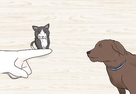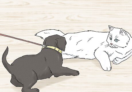 Put your puppy on a leash when you first introduce your pets. Attach your puppy to a leash so that you can keep it under control whenever your pets are together in the same room. Keep these visits short at first (e.g., 5-10 minutes) and do them several times a day. Eventually, you can build up to longer interactions.Alternative: You can also try keeping the puppy in a crate or enclosure while the cat wanders freely around the room. This way, they can get used to being around each other while the puppy is still contained. Once the puppy is calm while the cat is in the room, move on to leashed interactions. If possible, have someone else in the room at the same time so you can each pet, praise, and treat both the puppy and the cat for good behavior. Reward both animals for sitting quietly and staying calm. If your puppy gets overexcited and starts barking, take it out of the room. Similarly, take the cat out if it starts hissing, growling, or trying to swat the puppy. You may need to go back to keeping them in separate rooms for a longer period if this is a consistent problem.