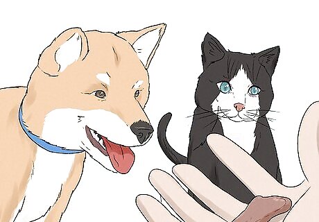 Offer a treat and praise as soon as the puppy responds to the command. If your puppy sits quietly when you give the command in front of the cat, reward it immediately. Give your puppy a favorite treat, pet it, and say “Good dog!” If the puppy ignores your command and starts barking, gently lead it a few steps away from the cat and try again. Keep moving away until the puppy is able to focus on your command. If it keeps barking at the cat or is too excited to focus, take your puppy out of the room and try again later.
