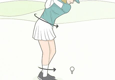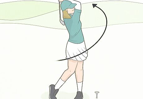 Hit the ball as hard as you can using only your core to swing the club. Keep your arms tight to your body until after you hit the ball. Keep uncoiling your backswing with just your core until you strike the ball, then straighten your arms all the way out away from your chest halfway through your follow-through swing. If you regularly overswing, using this technique will feel like you’re swinging at about half the strength of your normal swing, since you normally swing with your arms too. Even though it might feel like you’re swinging really short, you’ll actually get a lot more power by focusing on swinging the club with your core, plus you’ll have better form so the ball will travel straight and far.