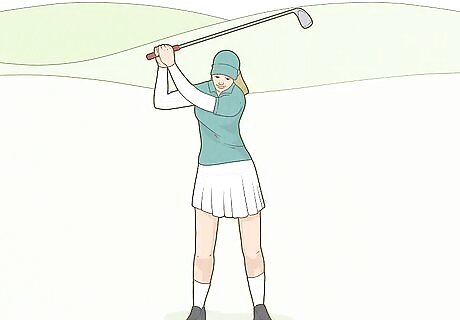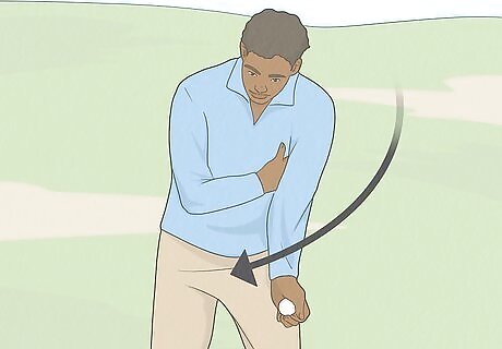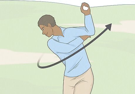 Swing the golf ball up like you’re swinging a club. Bend your arm up at the elbow at about a 45-degree angle and keep your elbow tight in front of your rib cage. Rotate back at your hips until the golf ball is above your head and your fist is about 3/4 of the way parallel to the ground. Imagine you’re holding a golf club and focus on keeping your form controlled and smooth.