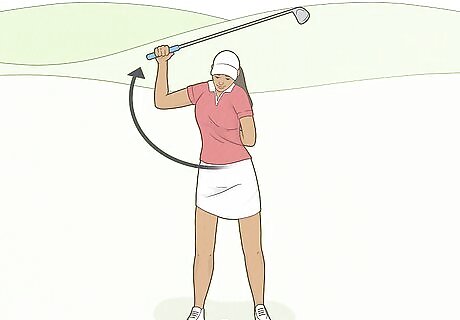 Rotate back at your hips until the club is 3/4 of the way parallel with the ground. Keep your elbow bent and in front of you and keep your feet firmly planted on the ground. Twist back at your hips as if you’re swinging the club back above your head, but don’t move your arm or the club at all. Stop twisting when the club is above your head and about 3/4 of the way towards being completely parallel to the ground. This will help you get the feel of how a shorter backswing should feel. Overswing often occurs because you’re swinging the club with your arms too much and flaring your elbow out on your backswing, rather than using your hips to swing the club while keeping your elbow tucked in tightly.