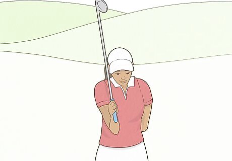 Bend your dominant arm straight up while holding the club. Place your non-dominant arm behind your back and focus only on the arm holding the club. Keep your elbow directly in front of your rib cage and bend your arm up, so that your golf club is pointed straight up in the air. For instance, if you’re holding the club with your right hand, place your left arm behind your back. Then, bend your right arm up at the elbow, keeping your elbow in front of the right side of your rib cage.