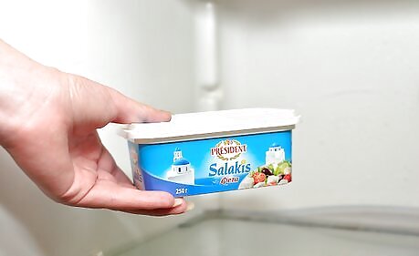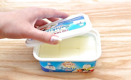 Put the feta cheese into a sealed container. Pour in any accompanying liquid (brine) and top up with more brine if needed. Place the lid on firmly.