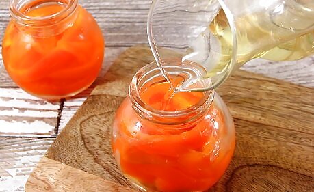 Cover the peppers with 2 parts vinegar and 1 part water and close the jars. Use distilled white vinegar and cold water. Leave ⁄2 in (1.3 cm) of headspace at the top of the jar and run a plastic knife between the peppers and the sides of the jar to remove any air bubbles before you screw the lids on. This is the standard ratio of vinegar to water to safely pickle and preserve the peppers. Some recipes may call for a different ratio or type of vinegar. If you are using a different recipe, follow it exactly to safely pickle your peppers.