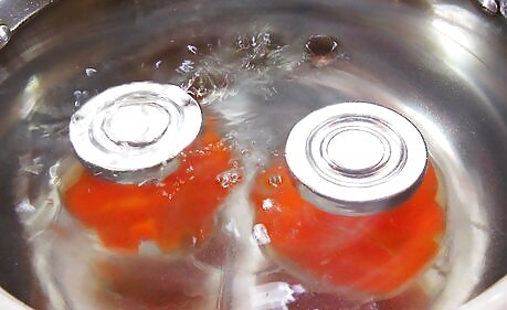 Remove the jars carefully and let them cool for 24 hours. Turn off the heat and use tongs to lift the jars out of the water. Be careful to keep them level and place them on a rack or towel to dry and cool. After 24 hours, check to see if the lids are sealed properly. The lids should be concaved towards the center of the jar, and if you unscrew the ring that holds them in place you should be able to lift the jar up by the lid. If the lids are not properly sealed, then repeat the boiling process again or store the jars in the refrigerator. You can store sealed, unopened pickled peppers for up to 2 years before they start to lose their quality.