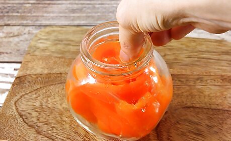Fill the canning jars with peppers to ⁄2 in (1.3 cm) below the rim. Place whole hot peppers or sliced bell or sweet peppers in the jars. Pack them tightly together, but leave headspace at the top. You can also add any other seasonings that you would like to the jar of peppers. Some common spices for seasoning pickled pepper are kosher salt, peppercorns, and garlic cloves.