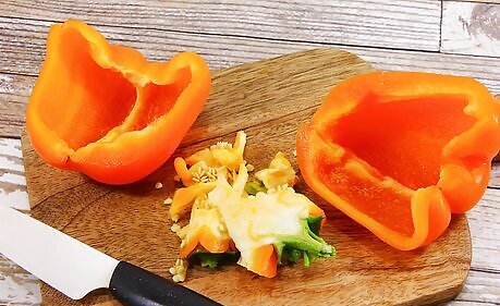 Cut bell peppers up to remove the seeds and membranes. Cut bell peppers or sweet peppers in half, pull out the seeds, and cut out the membranes. Cut the peppers into a size of your choosing. Consider how you will use bell peppers and cut them into strips or chunks that you can easily use straight from the freezer to prepare recipes like fajitas or soups.