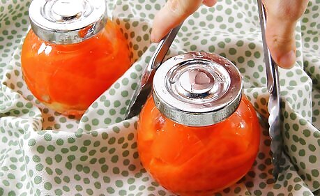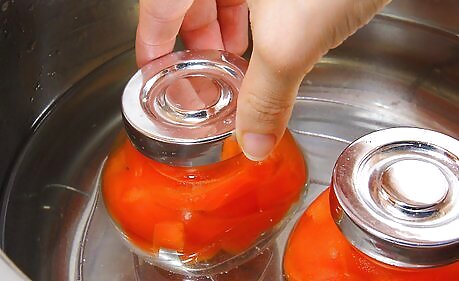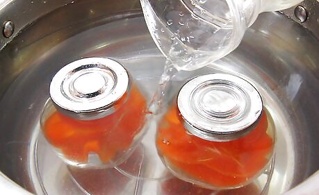Put the jars in a deep pot half full of hot water with a rack at the bottom. Use a metal or wooden rack that will keep the jars from touching the bottom of the pot. Fill the pot to about halfway with water and heat it up to just under boiling temperature, then place the jars carefully onto the rack. Make sure that the pot is deep enough that you will be able to cover the jars completely with more water after they are on the rack. Make sure the jars are not touching each other so that the water can circulate.