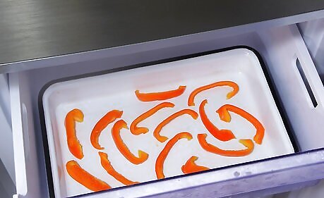 Put the sheet in the freezer for 15-30 minutes until the peppers are frozen solid. This is called flash-freezing and will keep the peppers from freezing together once you transfer them to a more compact storage container. Remove the sheet from the freezer when the peppers are hard to the touch.