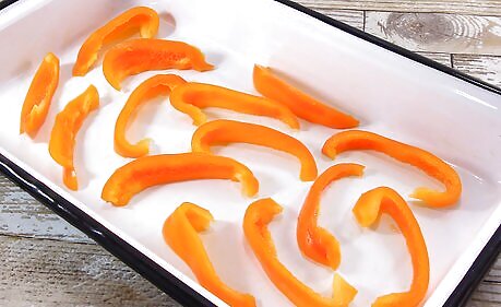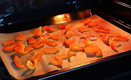Dry peppers in the oven if you don’t have a food dehydrator. Spread peppers out on a baking sheet so that they are not touching and put the sheet in an oven set to 150 °F (66 °C). Crack the oven door open so moisture can escape. Check on the peppers and rotate them with tongs every 30 minutes. Cut large peppers, such as bell peppers, into pieces and remove the seeds to decrease drying time. Leave smaller and hot peppers intact. It can take 1-2 hours to dry peppers in the oven. Peppers are dry when they are brittle to the touch.