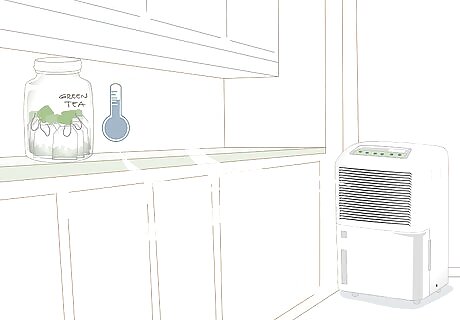 Avoid exposing the tea to moisture. Moisture can seep into and be absorbed by tea, causing it to grow bacteria and perish prematurely. It's important to choose a dry storage location to prevent this. Lots of areas that seem safe in the kitchen might actually be too humid for tea storage. For example, don't store your tea near an oven or stove, since those areas tend to get humid. Avoid counters near the sink, where dishwater splashes, and under the sink, which tends to be damp. Many basements are dark and cool, but they may be too moist for tea storage.