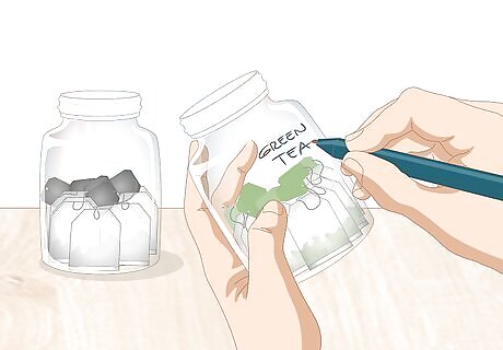 Label your containers to stay organized. This is especially helpful if you're storing several different types of tea! Write the name of the tea on the outside of the container so you don't have to open each container to know what's inside it. It's also a good idea to write the expiration date on the container, which you can find on the tea's original packaging. Opening storage containers repeatedly exposes the tea to oxygen, which will degrade the quality. Clear containers can be useful, since you'll be able to see inside without opening them. However, avoid clear containers unless you plan to store them in a completely dark area.
