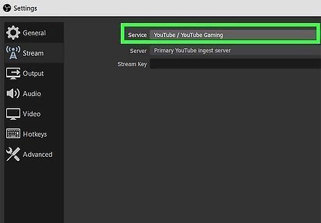 Click YouTube next to "Service." The stream will start on that account once it's connected. You'll need to follow on-screen instructions to enter your YouTube username and password to log in.
