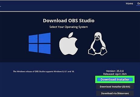 Download and install OBS from https://obsproject.com/. OBS is a free and popular video recording and streaming software that people use that allows the use of overlays, multiple inputs, and other features. Download the Windows or Mac version of the program, then follow the on-screen instructions to install the downloaded file.