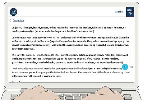 Put your complaint in writing. Sending a letter to the dealer provides a record that you attempted to work with them before you took the matter to court. In some states, you're required to present this when you file your lawsuit. However, even if it's not required, it can still save you a lot of time and money. There's a complaint letter template available at https://www.usa.gov/complaint-letter that you can adapt to your situation if you're unsure what to include in your letter.Warning: Avoid threatening the dealer with a lawsuit if they don't resolve your complaint. This could put them on the defensive and make them less willing to work with you, especially if they believe you wouldn't be able to win in court.