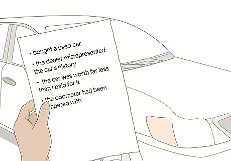 Gather evidence of the misrepresentation and your loss. To sue a dealer for misrepresentation, you need to also show that you suffered some loss as a result. It's not enough that you wouldn't have bought the car if you had known the truth. You also need to be able to prove that the dealer intentionally lied to you or deceived you in some way. For example, if the dealer rolled back the odometer so they could sell you a car that had significantly fewer miles on it than it actually did, you would need proof that the odometer had been tampered with, such as a previous title showing higher mileage. If you bought a used car, a vehicle history report may provide you with the proof you need that the dealer misrepresented the car's history. However, you would still need to show a loss in some way. Typically, this is done by showing that you lost money because the car was worth far less than you paid for it. If the misrepresentation involves a warranty or included services, gather any written proof you have of the warranty or included services offered along with evidence that those services were not provided for free.