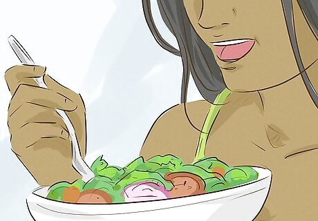 Eat a healthy, balanced diet. Build your meals around lean proteins and vegetables. Snack on fruits, nut mixes, and veggies, such as baby carrots or celery. Limit processed foods and simple carbs. Keep hydrated with water or herbal teas. Avoid caffeine and simple sugars, as they can stress your body.