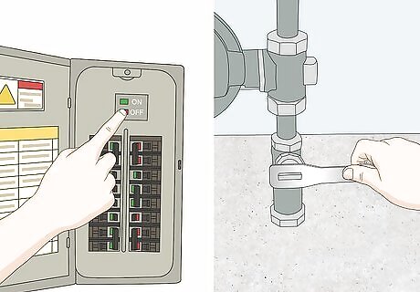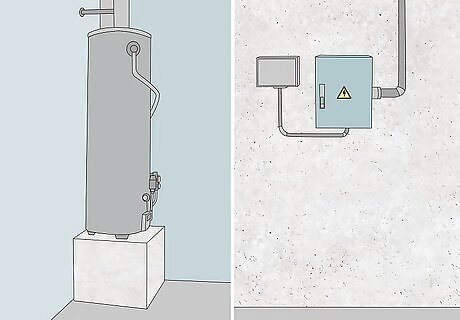 Reduce flood damage to utilities and valuables. Raise up your furnace, water heater, and electric panels. They should be installed on top of blocks or set higher in the wall than normal. This will better prevent them from getting wet. Before a flood occurs, store all valuables, such as expensive rugs, appliances, and important documents, on a higher floor in your home. Disconnect your utilities when there’s potential for a flood. Shut off the main valves and breakers. Unplug all electrical appliances unless you are standing in water. Take care of valuables before flooding begins. You may not have time to do this once the water starts rising.