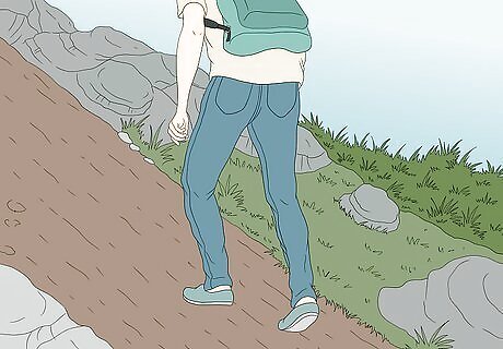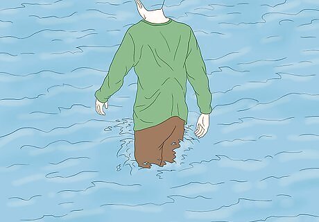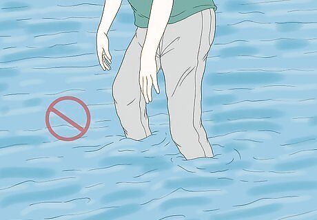 Avoid crossing through water. Water up to your ankles is enough to be dangerous. You cannot see how deep the water is the rest of the way. Six inches (15.24 cm) of water is enough to reach the bottom of cars and cause stalling. 12 inches (30.48 cm) will float away most vehicles. Never try crossing standing water. Keep in mind the motto, “Turn around, don’t drown.” When you’re in doubt about the water depth, don’t risk it. Children and pets should always be kept out of the water. It can get very deep or fast, and it’s difficult for even adults to escape once caught in it. The water also will be very dirty. If you have to go through water, bring a stick. Use it to measure the water’s depth and feel for stable ground.