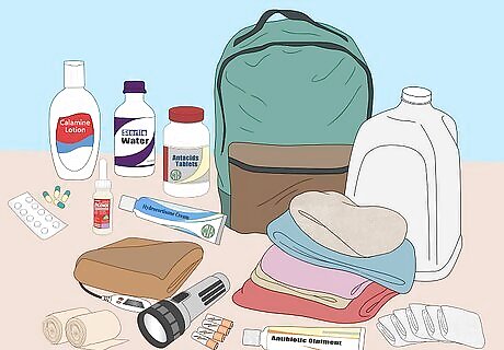 Assemble an emergency supplies kit. Ready a kit that includes basic necessities. A good kit will have enough food and water for everyone for at least three days. Pack at least three gallons of water per person so everyone can drink a gallon a day. Bring a week’s worth of any special medications your family needs and a first aid kit. Pack at least one clothing change for each person. Include warm clothing and waterproof gear. Remember to check your food supplies every year. Replace expiring food. Bring personal identification documents such as passports, driver’s licenses, birth certificates, and bank account numbers. Also pack some extra cash. Store these in a waterproof container. Think of what you and your family will need to complete your kit. You may include items like a can opener, duct tape, pet supplies, baby supplies, and sanitary items.