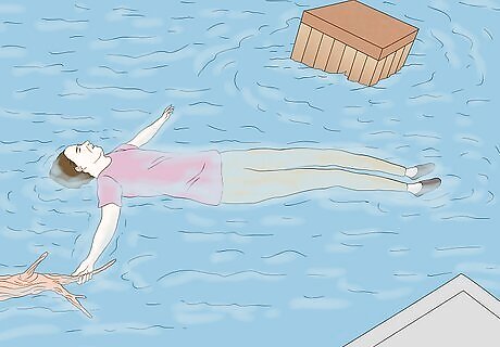 Swim backwards to survive moving water. Turn over on your back instead of fighting the tide. Keep your feet positioned upstream, using them to push away from obstacles floating with you. Try to find something to hold onto, such as a strong branch or roof. Once you do this, point your feet downstream and yell for help. Never go under debris. Keep your head above water and avoid the debris or pass over it. Yelling for help makes it easier for rescuers to spot you. Wave an arm if you have the strength. Don’t give up until someone comes for you.