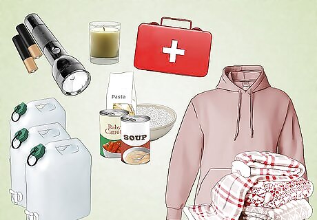 Stock up on supplies. Have enough medication, food, water, fuel, toilet paper, diapers, and so on stocked in your home. Make sure you have enough supplies to last at least a week. Ensure your first-aid kit is well stocked. Have plenty of extra sheets and blankets available. Get plenty of candles and matches. When the power goes out, you will need to have light to see. Be sure you have extra batteries. Always use caution when using candles. Purchase self-powered radios and flashlights. Some of these models will also charge your cell phone. Also purchase light sticks as well. Make sure you have water. Cleaning, then filling the bathtub is a good way to store water. You can quickly pour water directly into the toilet bowl to flush it. If bad comes to worse, you can melt snow to get water.