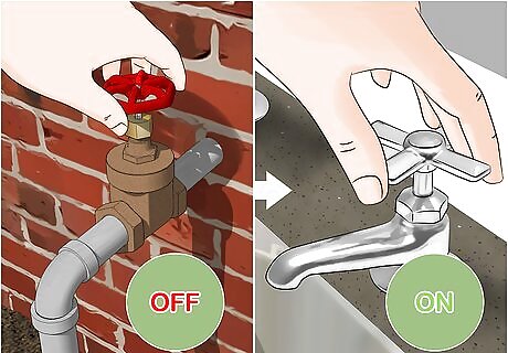 Turn off the main water supply and open faucets. This will prevent water from freezing in the pipes and rupturing them, thereby avoiding future expensive damage. Be sure to insulate any lines that will be exposed to the cold.