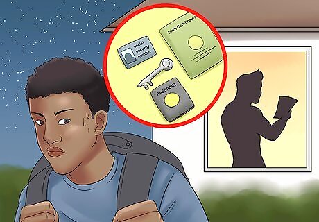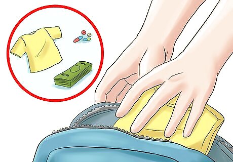 Pack a "go" bag. Find a small bag you can pack with everything you'll need for a few nights, just the essentials, and keep it in an easy-to-access place, so that you'll be able to grab it and leave at a moment's notice. It shouldn't look like a suitcase to your abuser: an inexpensive small bag will do. Pack several days of clothing, medications, enough money to cover the cost of a motel for a few nights, a cell phone, and important phone numbers and addresses. If you have children, or a pet, it's essential that you pack for them as well. Keep all packed belongings as portable and light as possible. Again, if you haven't taken the time to do this, don't wait and waste valuable time. Leave immediately and worry about the details later. Head to a domestic abuse shelter near you and they can help you sort getting your belongings once you are safe. If you have children, it might be better, depending on your specific situation, to put them in a secure situation before leaving. Consider leaving them with friends or relatives if you have that option and if your abuser won't check there.