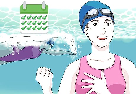 Dedicate yourself to a daily training regimen. For competitive swimmers, the “season” can last for 11 months per year. Even if you don’t have the highest aspirations for your competitive future, you need to be willing to embrace a program that involves training, practicing, or competing most days for most of the year. Olympic level swimmers may train all year long, 6 days a week, for up to 6 hours per day—with part of that time in the pool, and part of it doing strength training and flexibility exercises out of the pool. You may not need to embrace this level of dedication, depending on your goals, but a 6-day-per-week schedule for at least 1-2 hours per day is reasonable for a competitive swimmer.