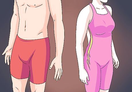 Use aerodynamic swimming gear. When swimming competitively, you’ll want to reduce as much water resistance as possible. This means wearing a form-fitting, aerodynamic swimsuit, and likely a swimming cap if you don’t have close-cropped hair. A pair of goggles that closely fits the bone structure of your face is also a must. Talk to your coach for advice on the best options. You may even want to shave your body hair to help you glide through the water just a tiny bit faster.