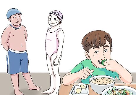 Promote a healthy body image and a healthy lifestyle. Kids who don’t naturally fit the long, lean body type of Olympic champion swimmers might feel inadequate or want to take unhealthy measures to change their body. Remind them that swimmers, like people in general, come in all shapes and sizes, and remind them that their focus should be on fitness, fun, and giving their best effort. Make sure child swimmers eat a healthy diet full of healthy carbs, lean proteins, and lots of fruits and veggies, and that they drink water regularly.