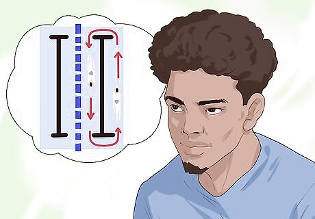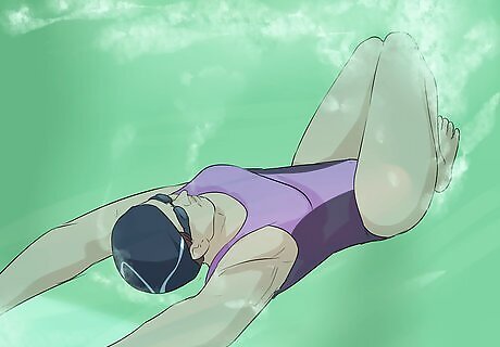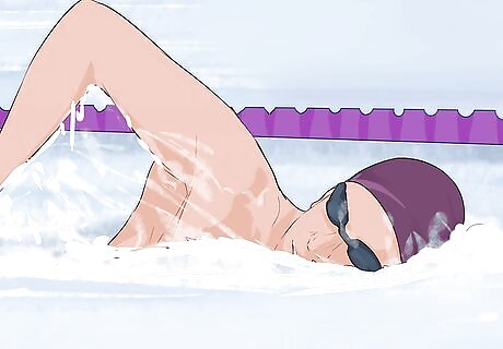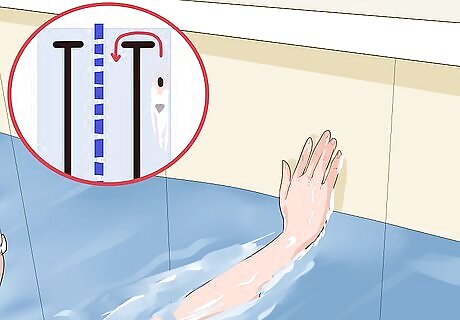 Turn at the end of the lane using an open turn. When doing an open turn, grab the edge with your left arm and brace your feet against the wall. Straighten your right arm and extend it behind you. Simultaneously push off the wall while throwing your left arm behind your head in a slicing motion. Once you’ve pushed off the wall, twist your body so that you’re facing the bottom of the pool. This turn is commonly used when circle swimming. It allows you to move away from the wall in a timely manner and stay out of the way of other swimmers. Practice this technique using smooth, controlled motions. You don’t want to run into any other swimmers in the pool.